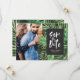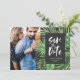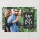 Tropical palm leaf and script foliage photo save the date