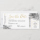 Tropical palm tree leaves (fronds) on a simple, modern, and minimal design boarding pass plane ticket save the date card perfect for a beach wedding or tropical island destination wedding with a chic retro-modern black and white with gold colour theme aesthetic. All text can be personalised, as well as the text and background colour. Click CUSTOMIZE FURTHER to do this in the advanced editor.