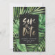 Tropical palm leaf foliage and gold script save the date