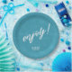 Colourful, paper plate design featuring a seamless pattern of palm leaves in shades of teal with bold, white 'Enjoy text. Add your initials and wedding date using the provided template. This tropical design is perfect for summer, beach and tropical weddings, birthdays and other special events. Search ID577 to see matching products.