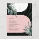 Blush pink and white arches over dark palm leaf beackground with vertical monogram at top and white line art palm leaf at right. Personalise the white text with reception details, accommodations, etc.