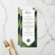 This design features tropical palm leaves as a backdrop to a modern style element. The beautiful greenery of the palms leaves compliment the elegant white modern structure in the foreground. Personalised initials using script typography create a perfect fusion of modern and chic. Lush greenery design ideal for a tropical beach destination wedding. Unique wedding menu card design with modern elements. Matching wedding invitations and other stationery items are also available.