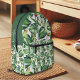 Tropical botanical themed backpack with a pattern of green palm leaves optional personalisation with a monogram and/or name in your choice of font styles, size, colour or placement or delete the sample text to leave the area blank in EDIT. ASSISTANCE: For help with design modification or personalisation or if you would like coordinating items, contact the designer BEFORE ORDERING via the Zazzle Chat MESSAGE tab below or email makeitaboutyoustore@gmail.com.