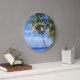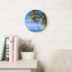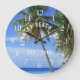 Beach house clock with a tropical palm trees background. Personalize with family name and established year.