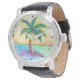 This decorative clock features a serene beach view with a silhouetted palm tree. The design captures a tranquil tropical scene, perfect for adding a touch of coastal charm to any room. It combines functionality with artistic flair, ideal for those who appreciate unique and stylish home decor.