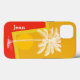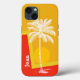 Stylish iPhone case, with graphics of a palm tree over an orange and yellow abstract sunrise background. Personalise the custom text for yourself or as a great gift idea.