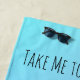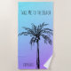 Enjoy this fun tropical beach towel design with the words "Take Me to the Beach" featuring a black palm tree silhouette with coconuts over a blue and purple sky. Personalise it with your name and phrase.