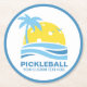 The perfect gift for pickleball players - coasters that feature a pickleball "sun" framed by a tropical palm tree and blue ocean waves. Add your custom text to personalise. Great for pickleball parties, club team events and dinks and drinks at your backyard home court.