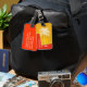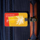 Spot your luggage from far away with this stylish acrylic luggage tag. Graphics of a tropical white palm tree against a yellow and orange abstract background of a sunrise. Personalise the white text running up the left side, and on the solid orange back.