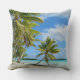 Throw pillow with a hanging palm tree on a white sand beach of a tropical island in the Pacific Ocean belonging to the Tahiti archipelago French Polynesia.
