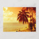 Postcard of palm trees at a beach on a tropical island in the pacific ocean at sunset.