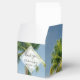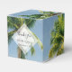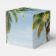This design features tropical palm trees on a beach. The beautiful greenery of the palms contrast against the blue sky and water. The opaque white diamond element brings the modern typography to the forefront. A perfect fusion of modern and chic. Palm tree greenery design ideal for a tropical beach destination wedding. Beach wedding favour box design with modern elements. Matching wedding invitations and other stationery items are also available.