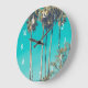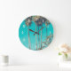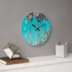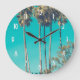 A clock with a beautiful photograph. Tall palm trees with long skinny trunks in front of a lovely green sky. Retro colour scheme. Relaxing and chill.