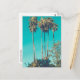 A postcard with a beautiful photograph. Tall palm trees with long skinny trunks in front of a lovely green sky. Retro colour scheme. Relaxing and chill.