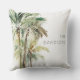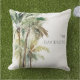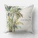 This outdoor throw pillow design features a group of beautiful tropical lush green and brown watercolor palm trees on a simple, clean white background. Perfect for a beach lover or a beach house. Personalise it with your family name. Created by Simply Farmhouse Press.