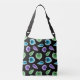 This cross body tote bag is shown in a black multi colour tropical palms print.