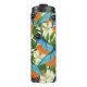 Surface pattern with papaya fruits, leaves and flowers and Superb Starling birds. Summer tropical pattern with birds and fruits. Superb Starling bird eating papaya seeds. Exotic papaya fruit pattern