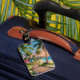 A beautiful luggage tag with a seaside tropical paradise illustration of a boardwalk along the coast, with palm trees with coconuts and strung fairy lights, blue ocean waves and small whimsical cottages.