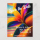 Beautiful Save the Date announcement postcard features a Bold and bright tropical floral and beach sunset art print | AI created surreal fantasy digital art.