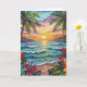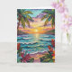 Pretty tropical thinking of you card. A cute coastal themed poem for a friend of family member to let them know they are in your thoughts. Gorgeous ai impasto oil painting style illustration of the blue ocean, a sandy beach surrounded by palm trees at sunset. Inside is a cute crab and sea glass.