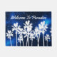Welcome your guests to paradise in this simple home welcome mat that provides a place for your guests to wipe their feet and invite them into your home with tropical palm trees silhouette in the background. Beach themed welcome mats with starry sky backdrop.