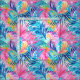 A seamless pattern featuring pink and blue palm tree leaves with yellow and minty green small accents. The design has a hand-painted look, combining soft and vibrant colours to create a fresh and whimsical tropical aesthetic.