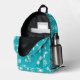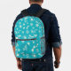Aqua blue backpack with tropical images pattern. Personalise with her first name initial on the zipper pocket. The monotone, off-white pattern, which covers the bag, is made up of palm trees, sea stars, seashells, sunglasses, and more. The initial template is also off-white and is printed over a darker blue oval shape.
