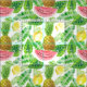 Watercolor pattern with tropical leaves and fruits.