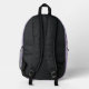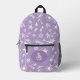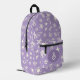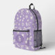 Purple backpack with tropical images pattern. Personalise with her first name initial on the zipper pocket. The monotone, off-white pattern, which covers the bag, is made up of palm trees, sea stars, seashells, sunglasses, and more. The initial template is also off-white and is printed over a darker purple oval shape.