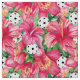 Tropical pickleball pattern with green leaves, pink hibiscus flowers and white pickleballs on dark green background