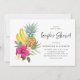 Invite guests with this colourful tropical couples shower invitation. It features watercolor illustration of pineapples, bananas, plumerias and hot pink hibiscus. Customise by adding your names, date, time and other event details. This tropical invitation si perfect for summer and luau couples showers.