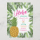 Tropical Pineapple Baby Shower Invitation. Aloha. Girl Baby Shower. Tropical Party. Summer Hawaiian Laua Leaves . Gold and Colourful Pineapple. For further customisation, please click the "Customise it" button and use our design tool to modify this template.