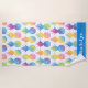 Tropical style beach towel features a pattern of vibrant rainbow coloured pineapples with a watercolor tie-dye gradient. Personalise the custom text with blue background with first name, last name, or other preferred wording.