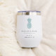 These elegant minimalist wine tumblers make great bridal party gifts or destination wedding favours for your summer or tropical wedding. Clean minimal design features your names, wedding date, and location in classic black serif lettering. A pineapple illustration in turquoise teal aqua completes the design.