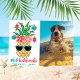 Tropical theme Christmas photo card features a cute, happy pineapple with colorful string lights, ornaments and sunglasses and a Hawaiian "Mele Kalikimaka" greeting. Personalize the name and greeting at the bottom along with a favorite photo (humans or pets!). Original artwork KL Stock.