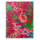 A tropical theme artwork of a pink flamingo and green tropical jungle plants with hibiscus flowers and palms against a neutral white background. A fun and colourful art piece.