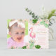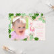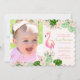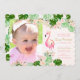 Let's play the Flamingo way – It's her birthday! This adorable invitation is the perfect tropical party destination. Insert your own photo, and invite friends and family to party island style with you on her special day. Hand painted watercolor flowers and jungle leaves surround the photo and text, with a handprinted watercolor flamingo crowned with flowers. White with jungle leaves in greens on the reverse.