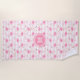 This pretty tropical themed summer beach towel has a pattern of pink flamingo birds and faux gold circle dots. The images are placed on a lighter pink and white striped background. At the centre is a matching pink circle banner with your monogram in lighter pink.