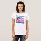 A ladies "baby doll" T-shirt with a beautiful sunset (or sunrise) over tropical waters framed by a graceful coconut palm based on a painting by Joan C. Thomson