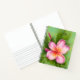 A lovely Plumeria blossom, also called frangipani, with petals of pink shading to orange at the centre and surrounded by green tropical leaves embellishes each sid of this notebook along with name text that may be personalised.