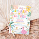 Make a splash with this vibrant tropical pool party birthday invitation, perfect for summer celebrations! Featuring playful illustrations of flamingo and swan floats, pineapples, watermelon slices, sunglasses, and tropical flowers, it sets the tone for a fun-filled day. This cheerful design is ideal for kids birthdays, pool parties, or summer gatherings, bringing a colourful and festive vibe to your event. Personalise easily with party details and impress guests with a stylish, eye-catching invite.