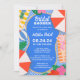 Colourful, modern and trendy summer bridal shower invitation. The bridal shower details are written on the blue water of the pool in white text. The aerial view shows women sunbathing poolside, red and white umbrella tops, beach balls, and tropical flowers and palm leaves. Blue and white tile provides the background. This item is part of the Bridal Shower Pool Party collection.