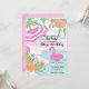 Cute watercolor painting of a pool with a pink flamingo floatie, tropical flowers and palm trees. Use it for a birthday party, bridal shower, pool party, family reunion or tropical getaway