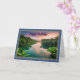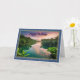 This man's birthday card showcases a breathtaking tropical scene at sunset. The image features a serene river winding through lush, vibrant greenery, with tall palm trees and various tropical plants lining the water’s edge. The sky is ablaze with warm shades of orange, pink, and purple as the sun sets in the background, casting a soft, golden reflection on the tranquil water. The card is framed with an ornate gold border against a deep blue background, giving it a luxurious and elegant feel. The text "Happy Birthday" is boldly displayed in a stylish font at the top centre, adding a personal touch to the card.