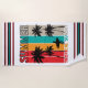 Bold, energetic, and full of summer spirit, this vibrant design captures the thrill of a tropical adventure. Fiery red and orange tones meet cool teal and beige stripes, setting the stage for a surfer’s silhouette strolling towards the waves. Towering palm trees frame the scene, while playful typography emphasizes the carefree essence of SUMMER and TROPICAL SUNSET. This dynamic look is perfect for anyone who lives for warm evenings, ocean breezes, and the endless call of the surf.