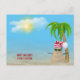 Christmas sand snowman with sunglasses and striped cap in beach sand with holiday lights on palm tree.
