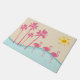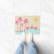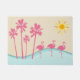 Here's a tropical scenic door mat or welcome mat for the front of your house including a pretty beach theme with sand, palm trees, pink flamingos, and an artsy sun. Welcome your guests to your home in a tropical beach scenic vector image.