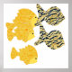 Mosaic, graphic drawing, with group, of striped, and stencil-patterned, fish-displayed in bright, colours of; orange, red, yellow, gold, taupe, brown, black, and white.