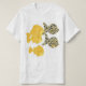 Mosaic, graphic drawing, with group, of striped, and stencil-patterned, fish-displayed in bright, colours of; orange, red, yellow, gold, taupe, brown, black, white.