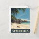 This card features a stunning vintage-style illustration of a tropical beach in the Seychelles. The design captures the iconic granite boulders, lush palm trees, and clear turquoise water that the islands are known for. The retro-inspired colour palette and bold typography give it the feel of a classic travel poster, perfect for sending a note from a serene getaway or for any lover of beaches and tropical destinations.